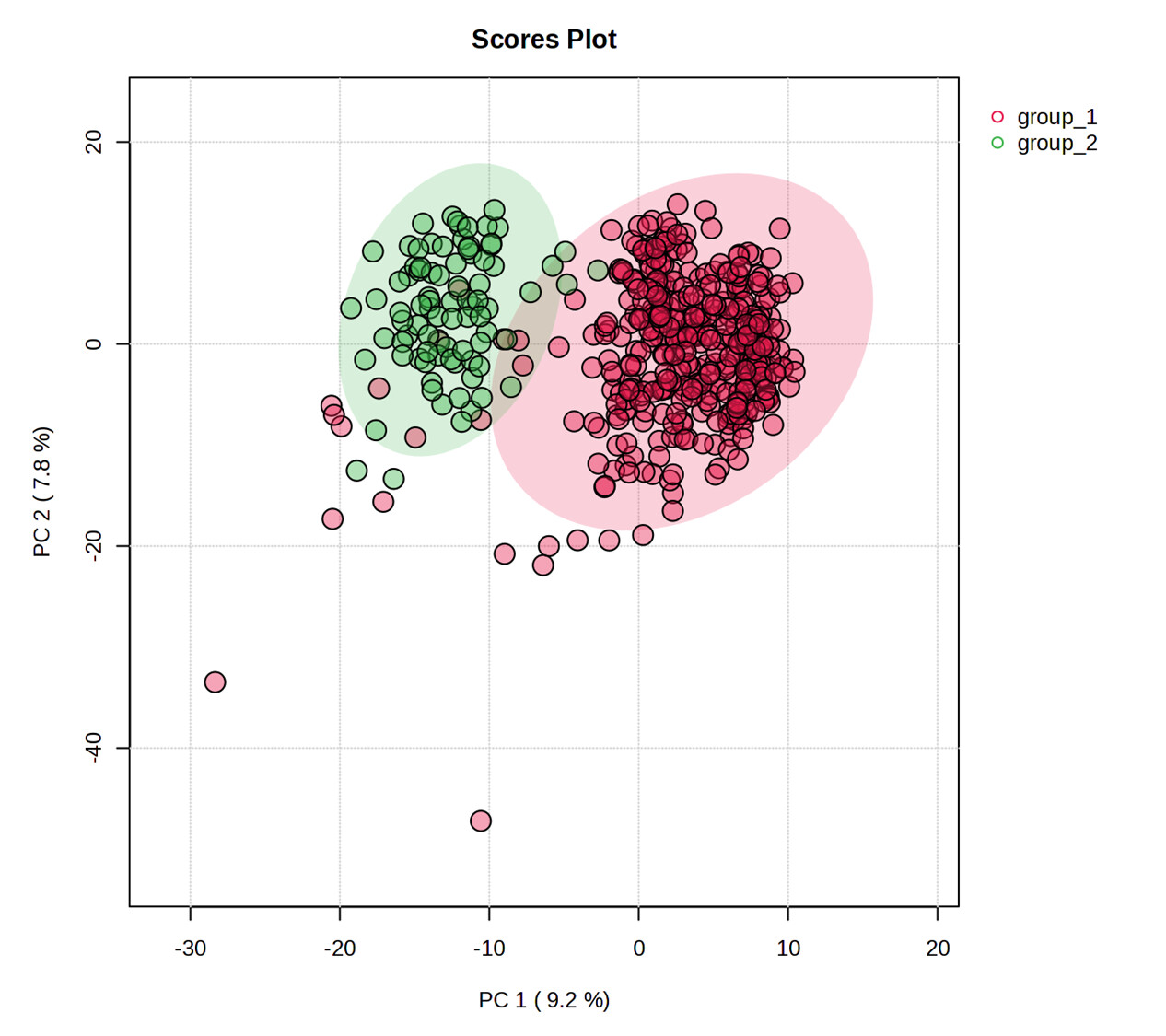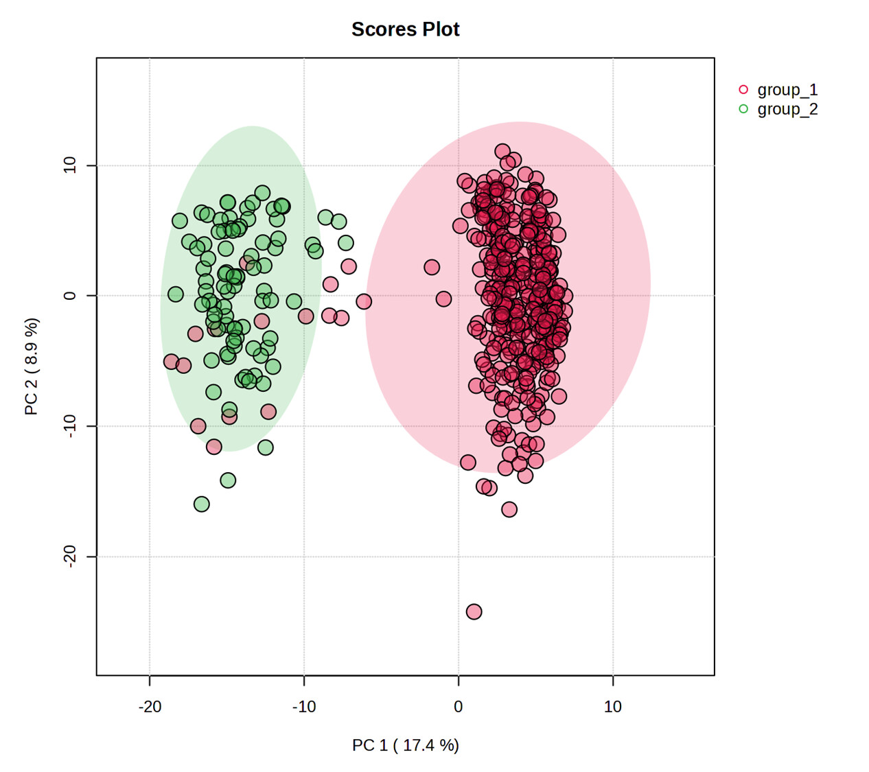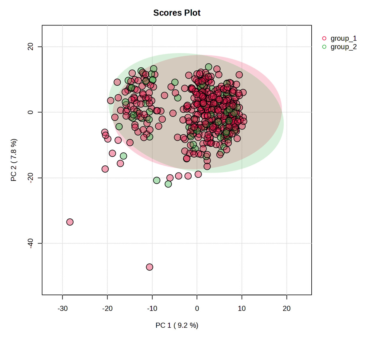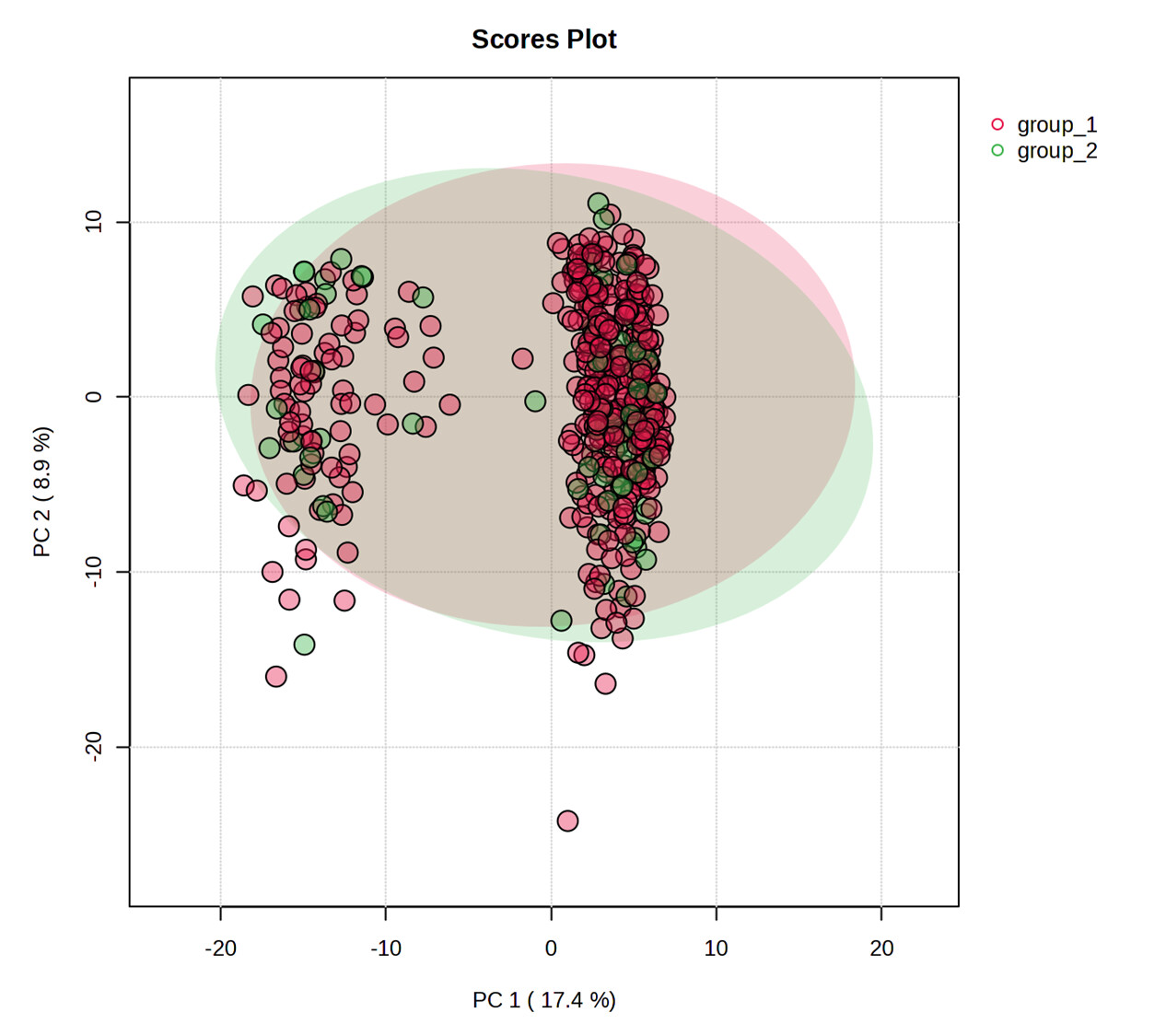 ie. No data filtering, imputation = 20% of lowest pos. value, Median normalized, log10 transformed and Pareto scaled.