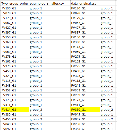 I’ve come across another example today with a dataset which is small enough to be uploaded. The attached files have the same data but one has the samples (rows) in a random order while the other has sorted the data to have all the samples belonging to the same group next to each other.