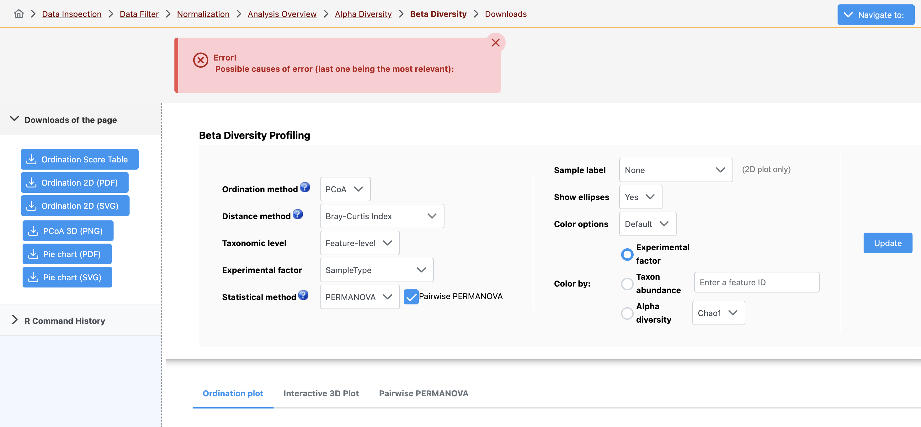 The issues seems partially fixed now, as PCoA are correctly displayed, but it seems there is something wrong with phylogenetic-based metrics (see below). The match was properly assesed.