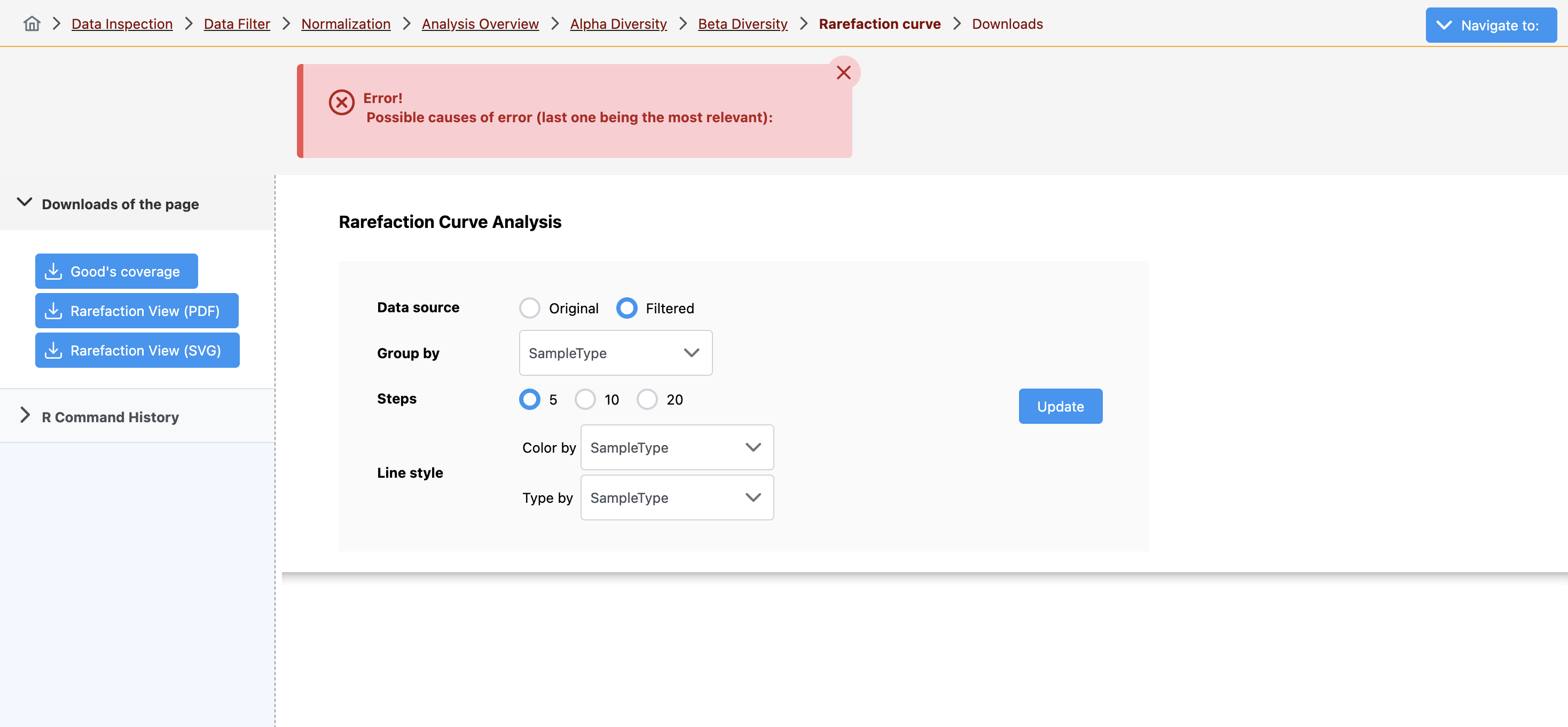 We are also experiencing the same issue with beta diversity and sometimes with taxa barplots. We are also seeing issues with LEfSe where a message pop ups stating no significant features were identified, however a dot plot appears.