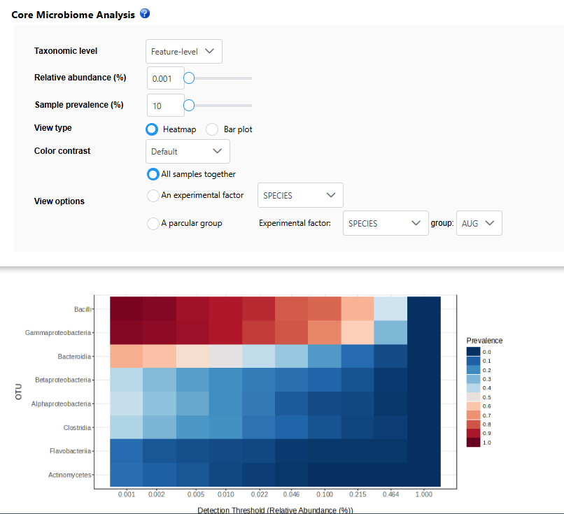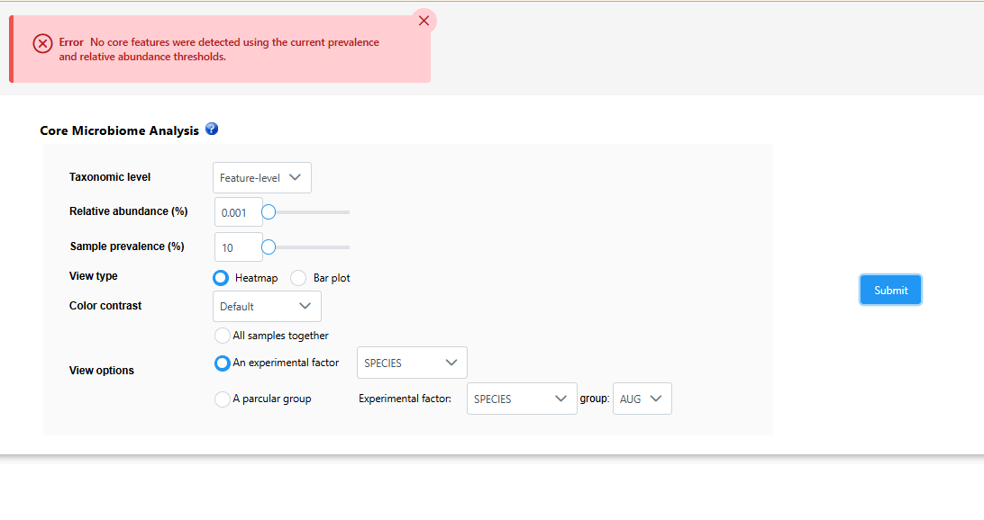 I keep getting error messages when attempting to get the core microbiome for experimental factor levels in my data. I can get a heatmap for all samples, though when I change the options to view for an experimental factor it comes up with error message “No core features were detected using the current prevalence and relative abundance thresholds”. I have reduced the prevalence and relative abundance to 0.001 and 10 respectively and still getting the error.