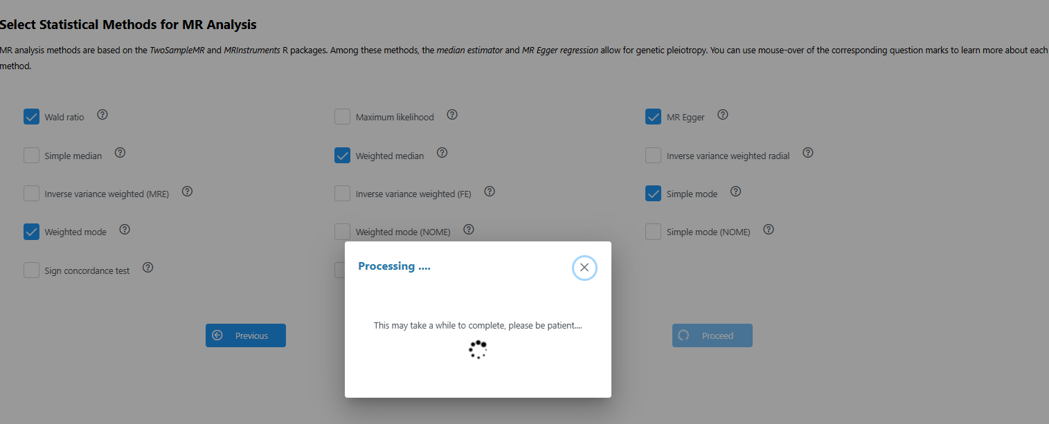 I can’t perform Mendelian randomization analysis. Why is there no response after clicking ‘processing’?